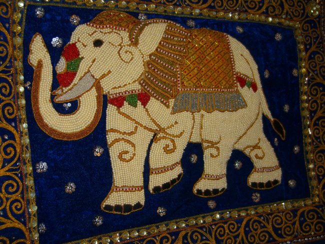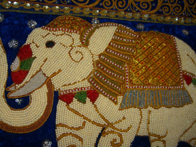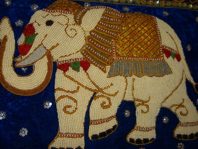 Hand embossed elephant with cream pearl beads. The elephant looks