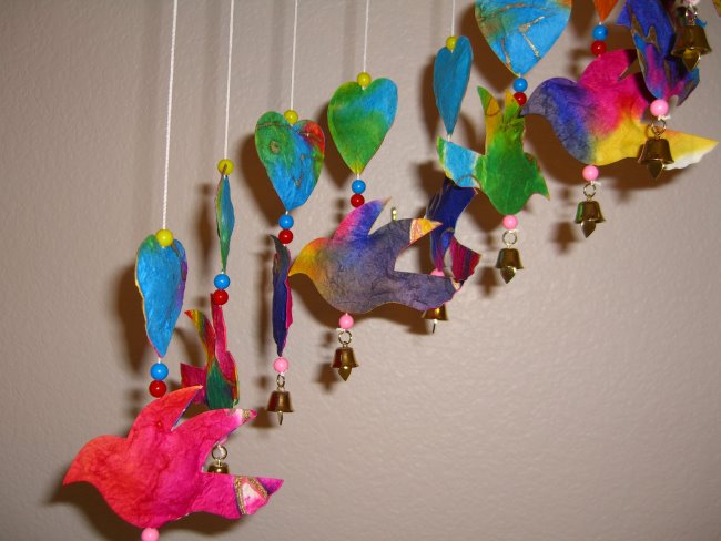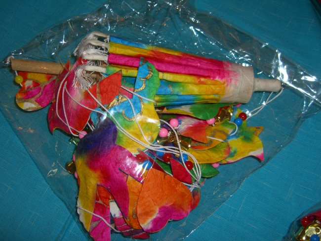Batik saa paper umbrella suspend three dimensional. Each arm of the mobile also has a small bell, when the mobile catches the breeze its makes a gentling tinkling sound. We have assortment of hanging shapes; saa paper Angle, Christmas gift box, Elephants, Fish, Birds, and other shapes in spiral pattern. Some all the same, some mix-and-match. No two are exactly the same since they are hand made and very colorful.