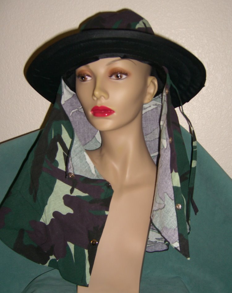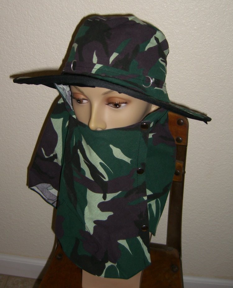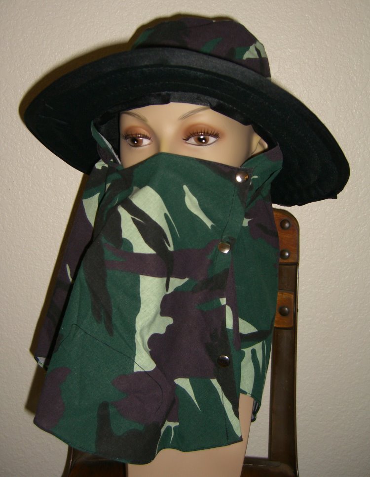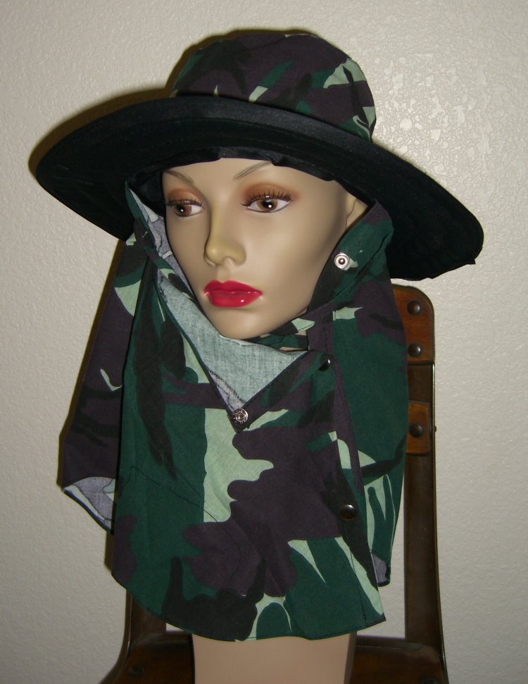This is Unisex Sun Hat or Sport Hat made of cotton fabric materials green camouflage. Each hat has three snap buttons keep the drape wrapped around your neck and face, 2 3/4" brim all around, and has black nylon liner. There are ties for secure tie under your chin. It's can be worn several ways. Hand wash and hang dry.