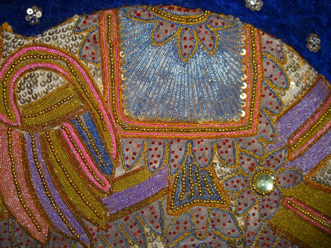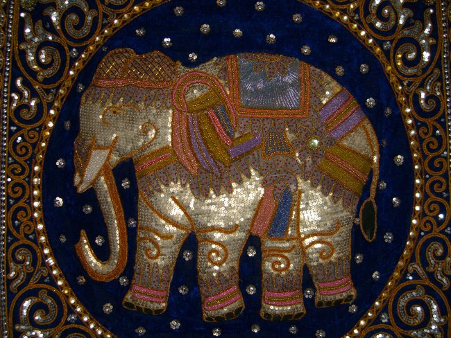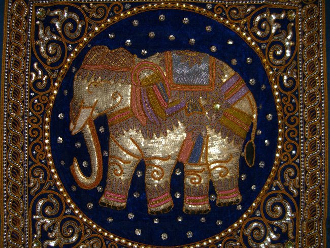 A Single Fancy Silver Elephant Standing in a Circle Squared Kalaga Tapestry Wall-Art.