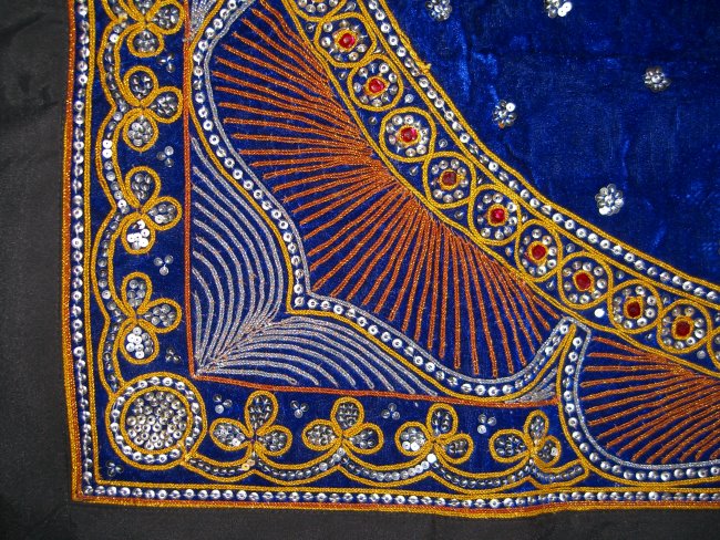 sequins, blue and brown cords all around the block. Blue velvet