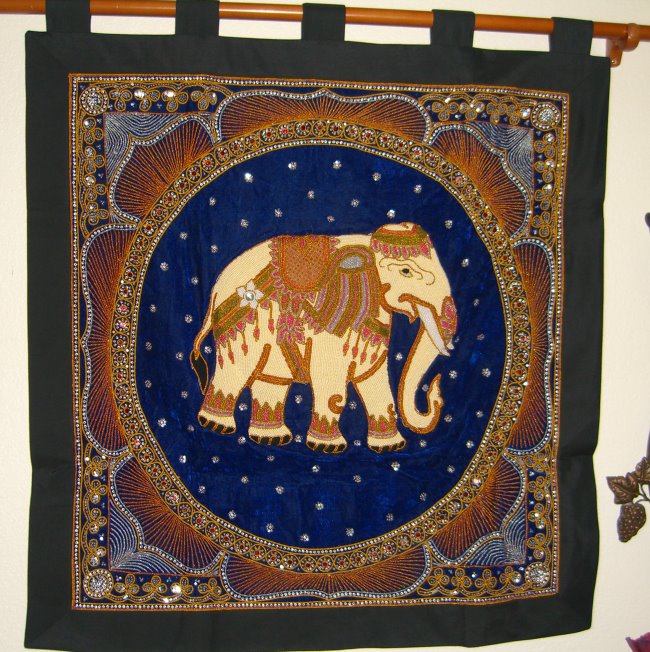 A Single Fancy Pearl Elephant Blue Velvet Squared Kalaga Tapestry Wall-Art.