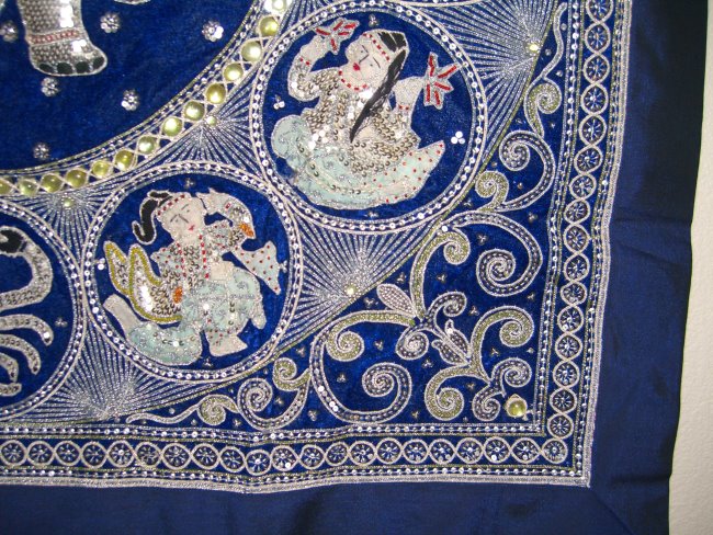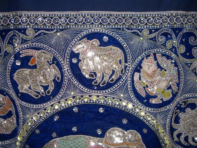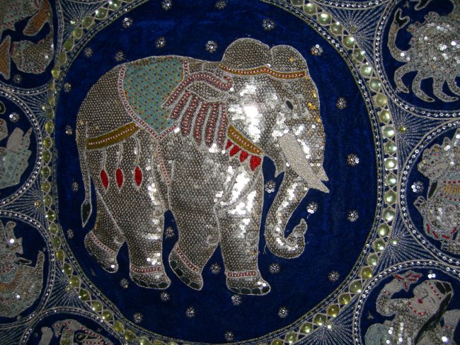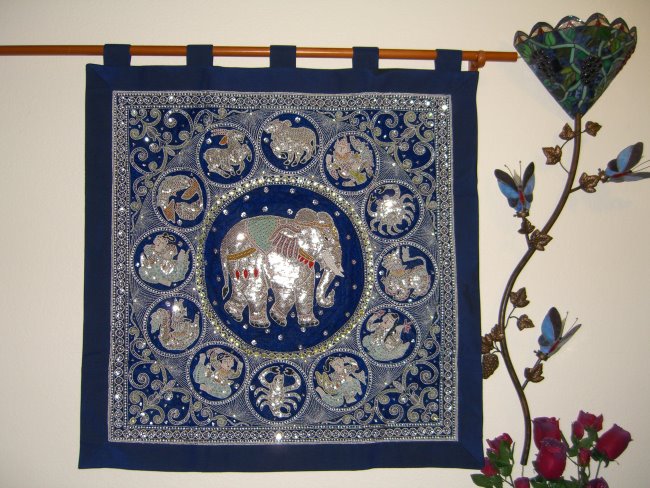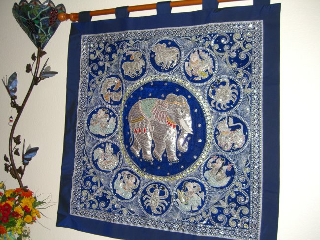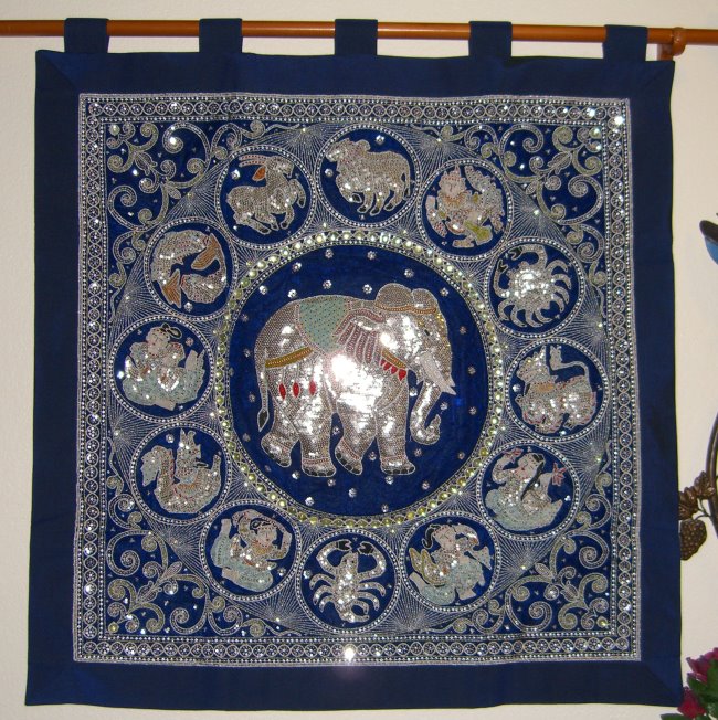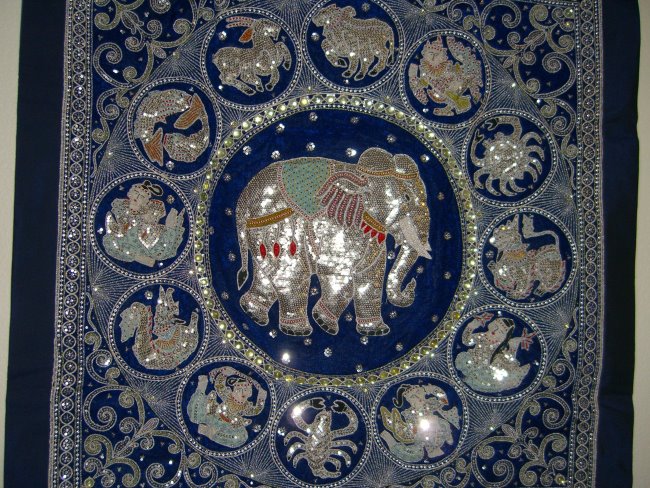 12 zodiac circle. Hand embossed elephant with silver disc sequins,