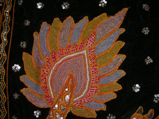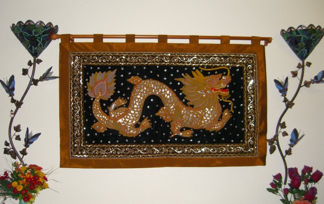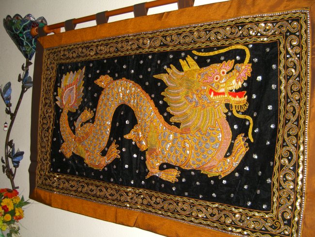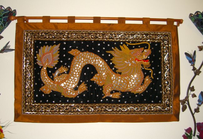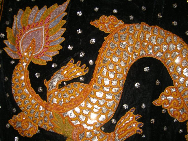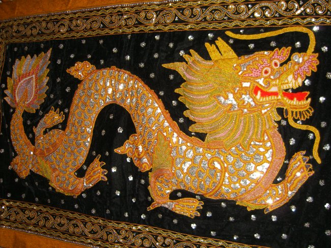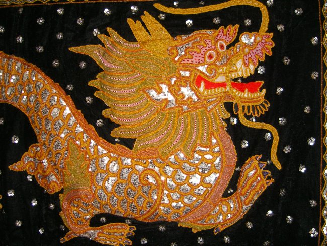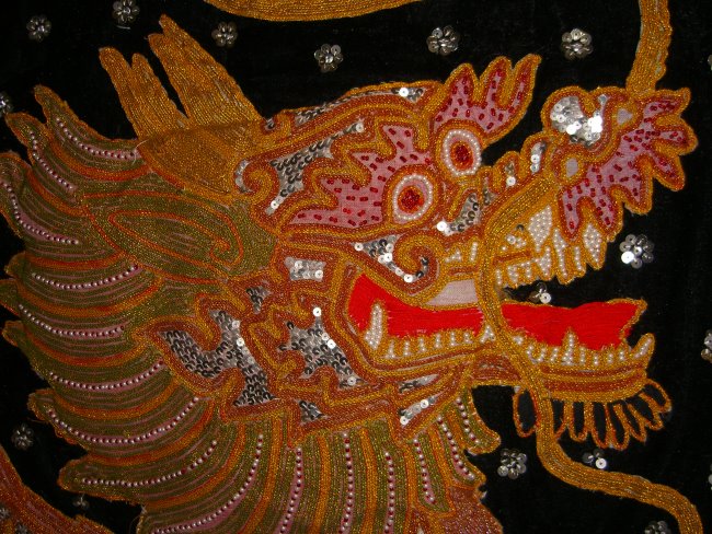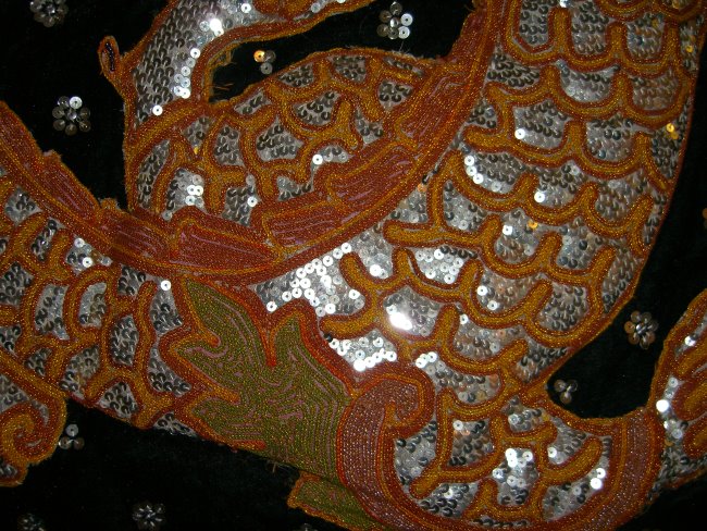 embossed dragon with silver disc sequins, golden and brown colored