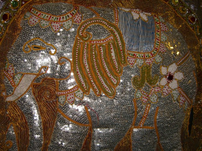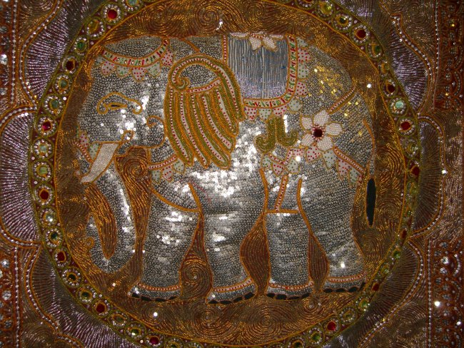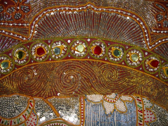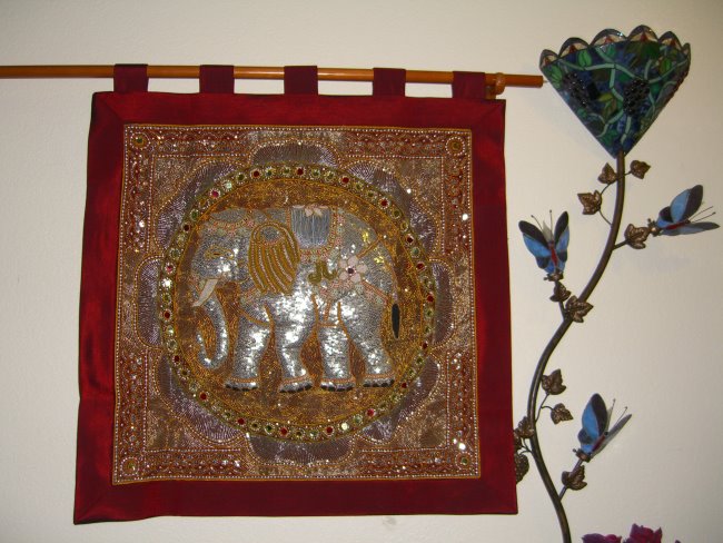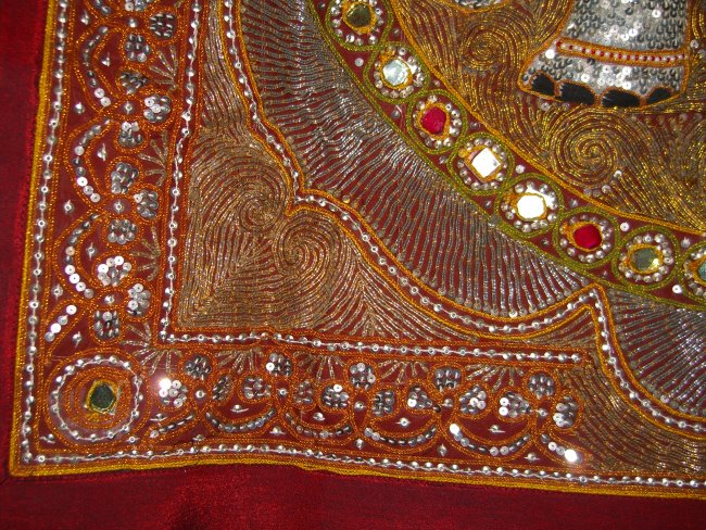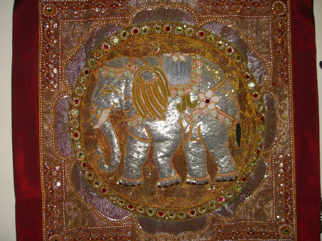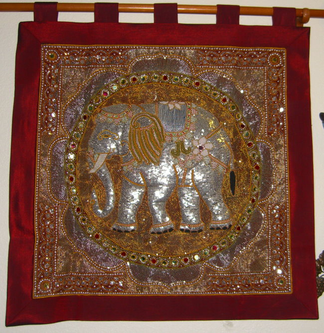 A Single large Elephant, Assorted Colored Glass beads around the Circle, Red Maroon Squared Kalaga Tapestry Wall-Art.