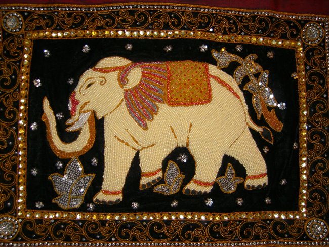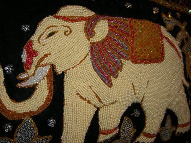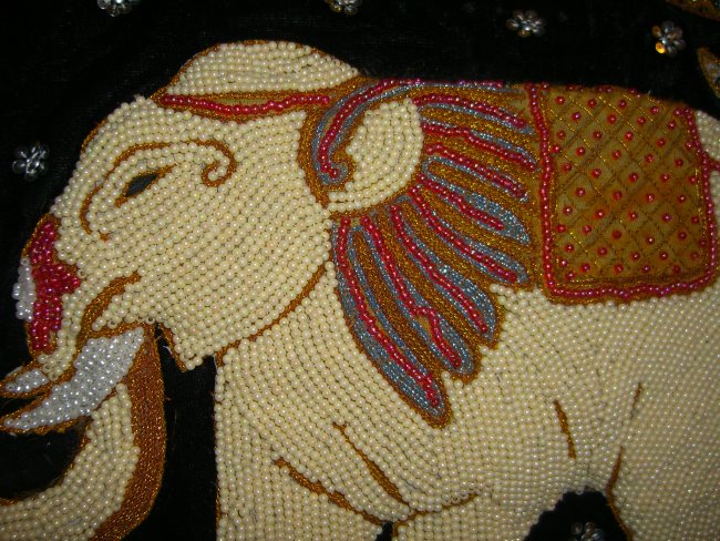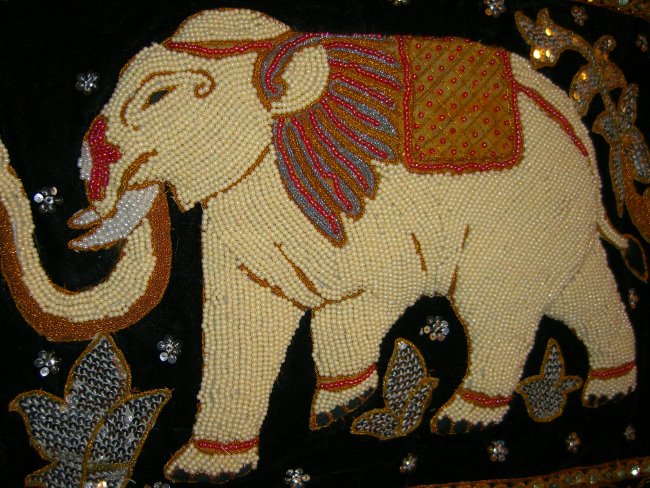 Hand embossed elephant with cream pearl beads. The elephant looks