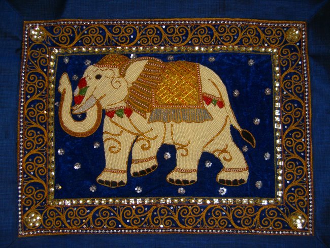 Hand embossed elephant with cream pearl beads. The elephant looks