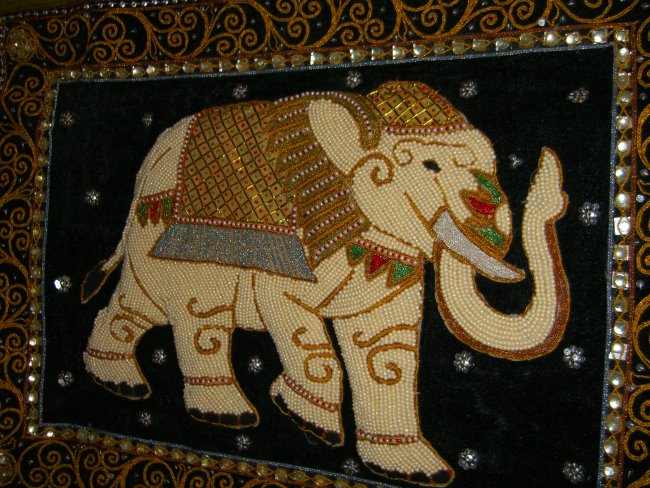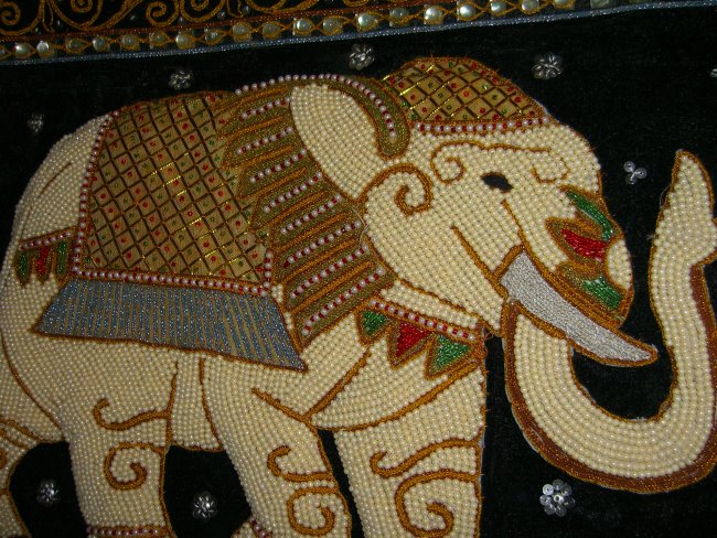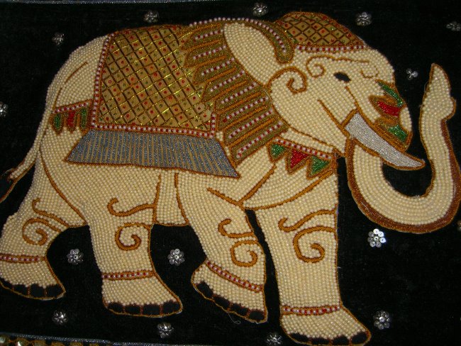 Hand embossed elephant with cream pearl beads. The elephant looks