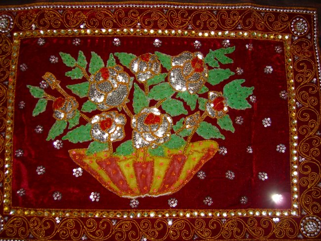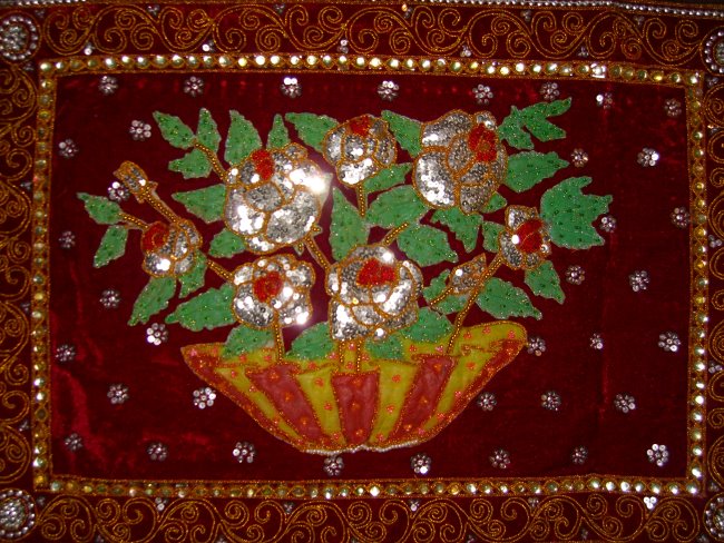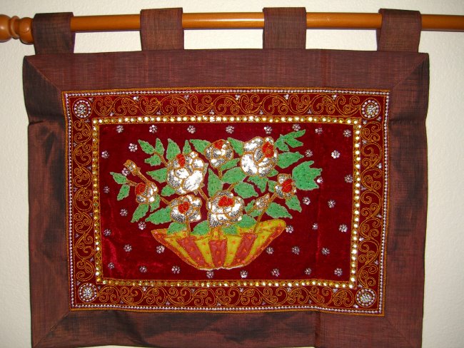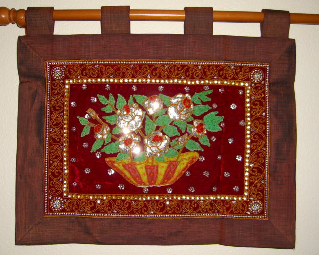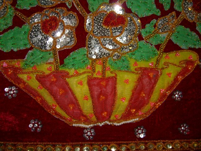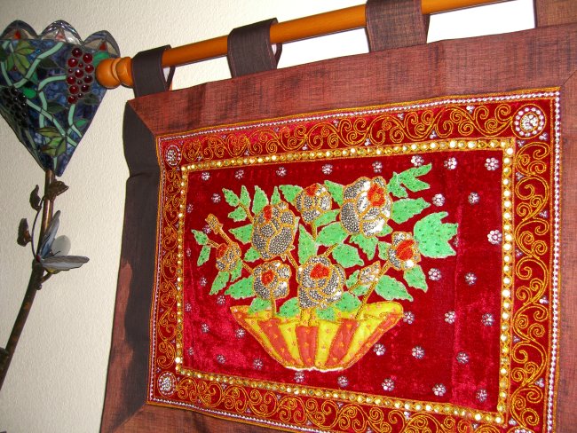 This is Rose Flowers Sequins in Red and Yellow Ruffled Vase, Red Velvet Small Kalaga Wall-Art.