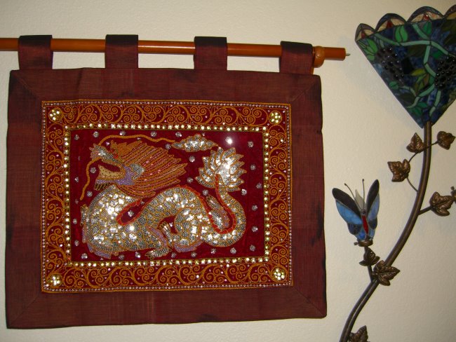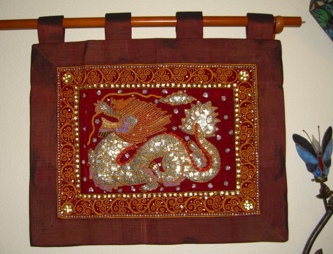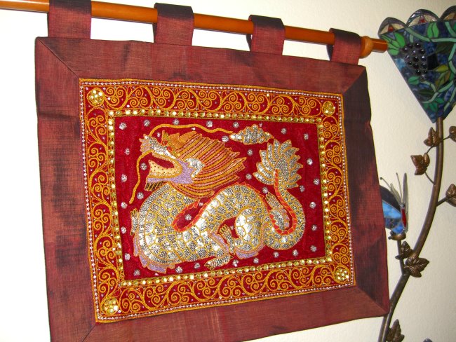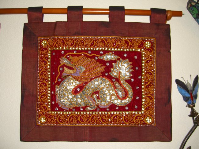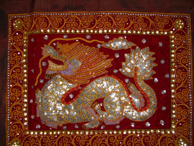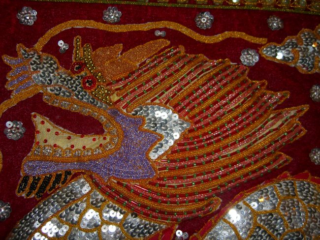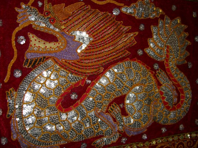 embossed dragon with silver disc sequins, golden and color cords,