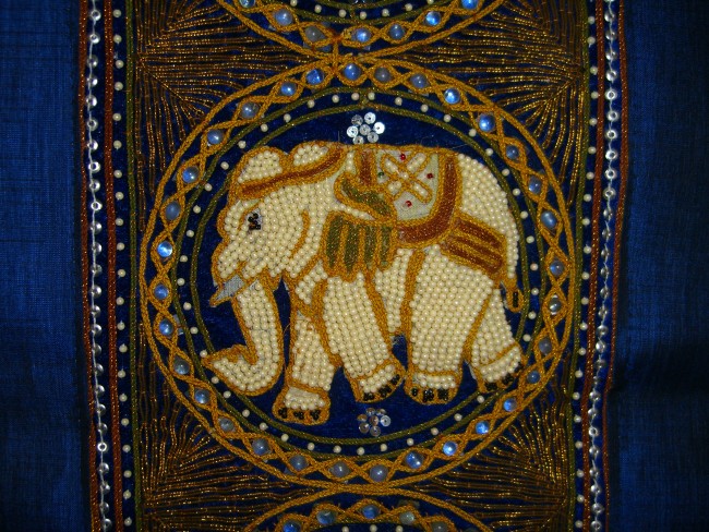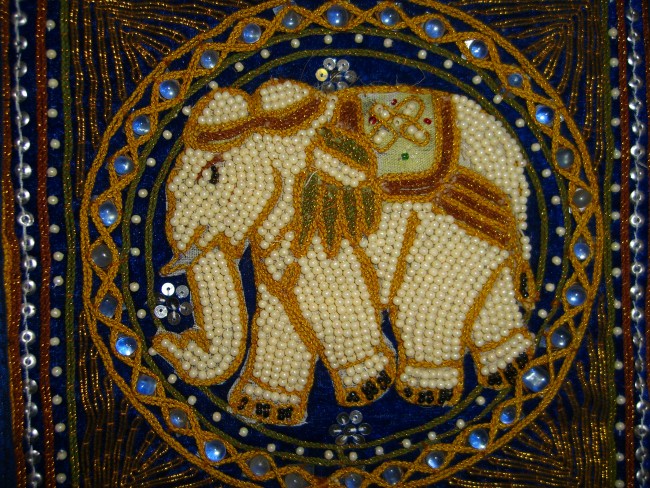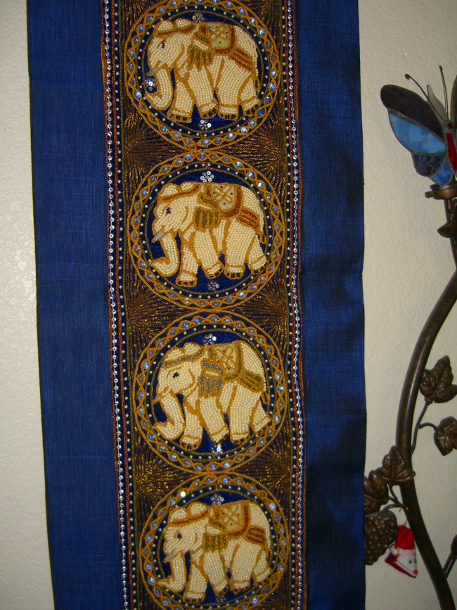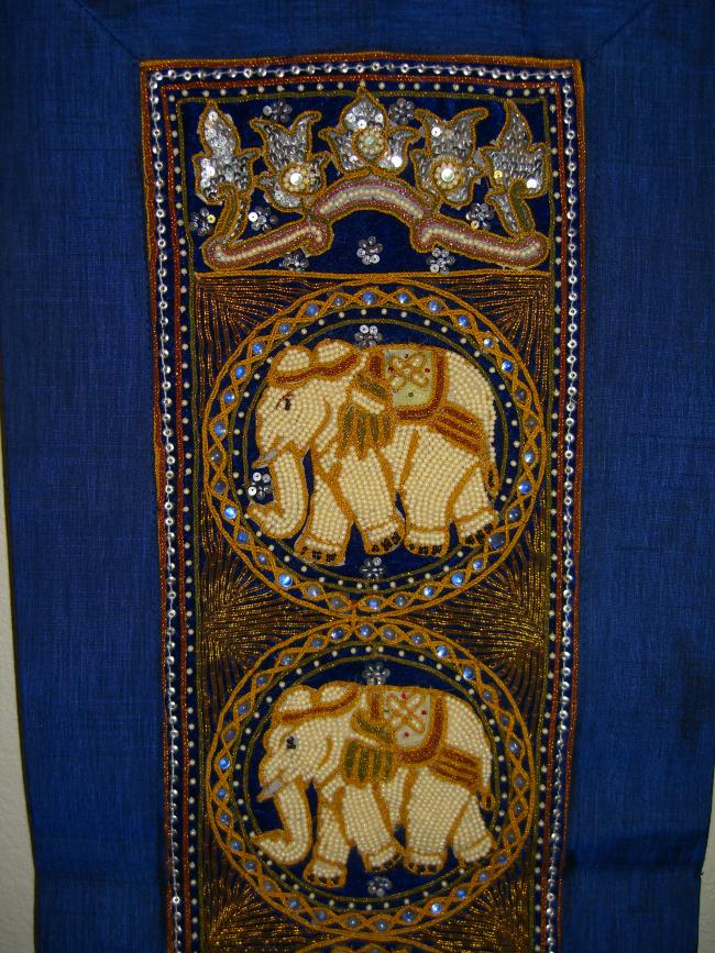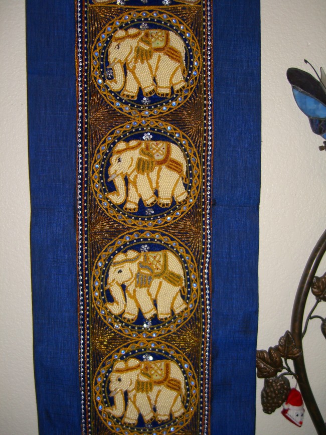 This is Four Pearl Elephants a smaller version vertical Kalaga Tapestry Wall Art.