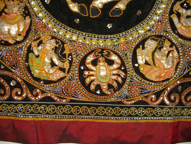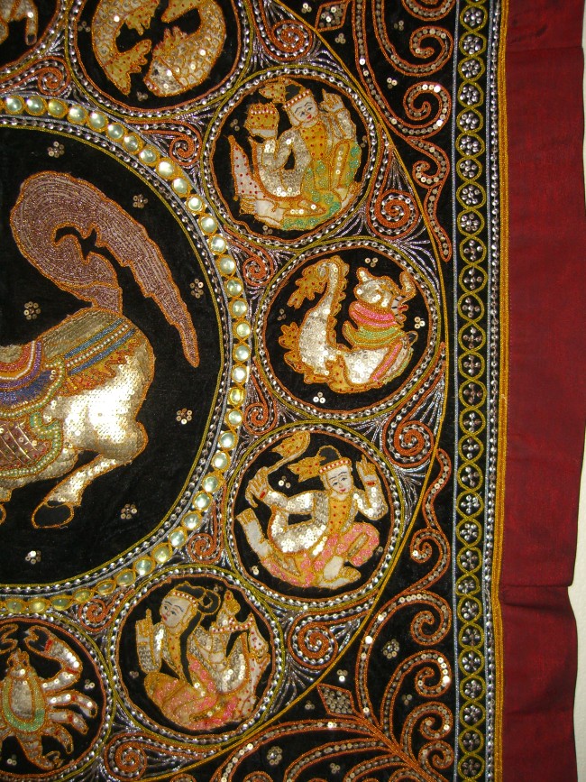 the block. Black velvet background and red-maroon silk border.