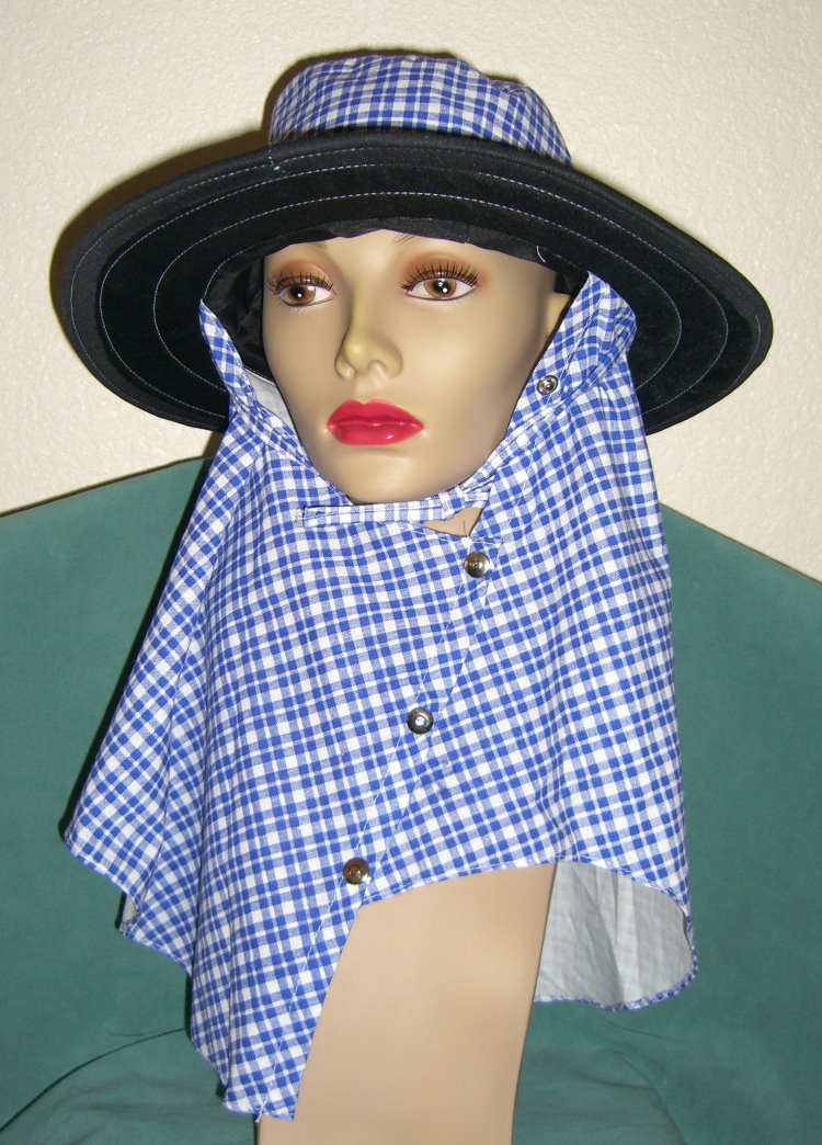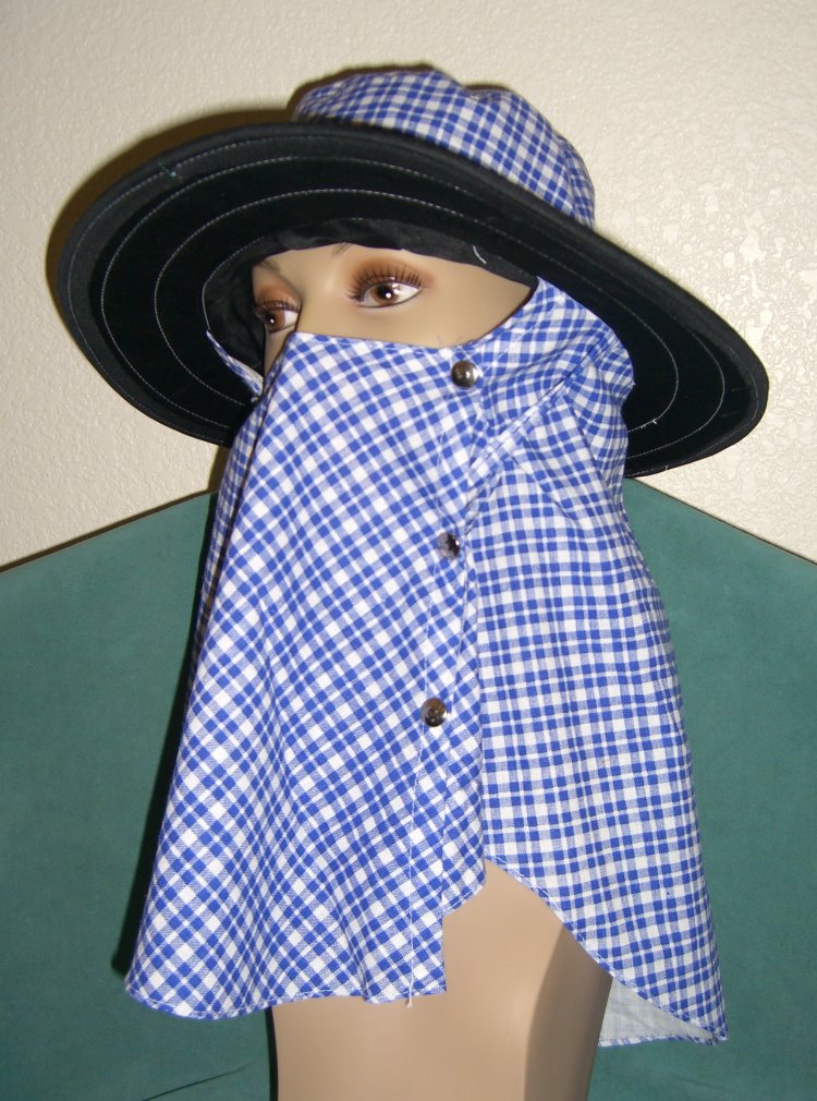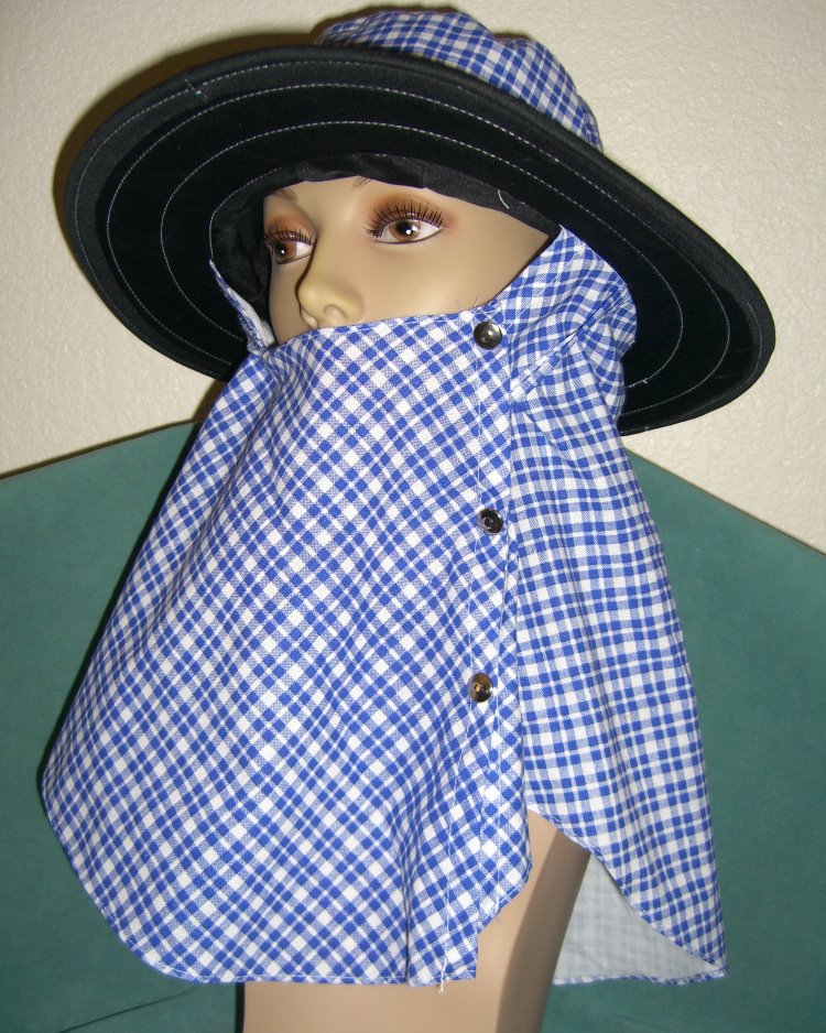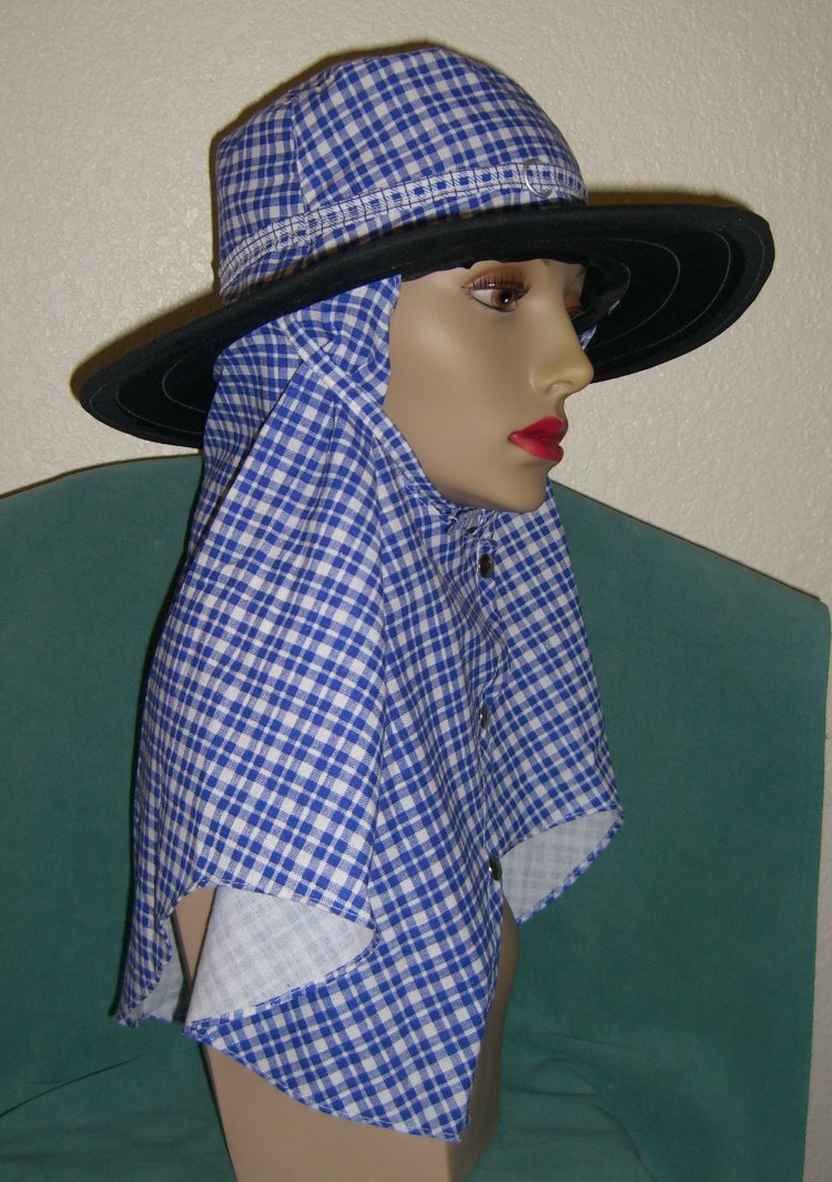 This is Sun Hat or Sport Hat made of cotton fabric materials blue and white color. Each hat has three snap buttons keep the drape wrapped around your neck and face, 2 3/4" brim all around, and has black nylon liner. There are ties for secure tie under your chin. It's can be worn several ways. Hand wash and hang dry.